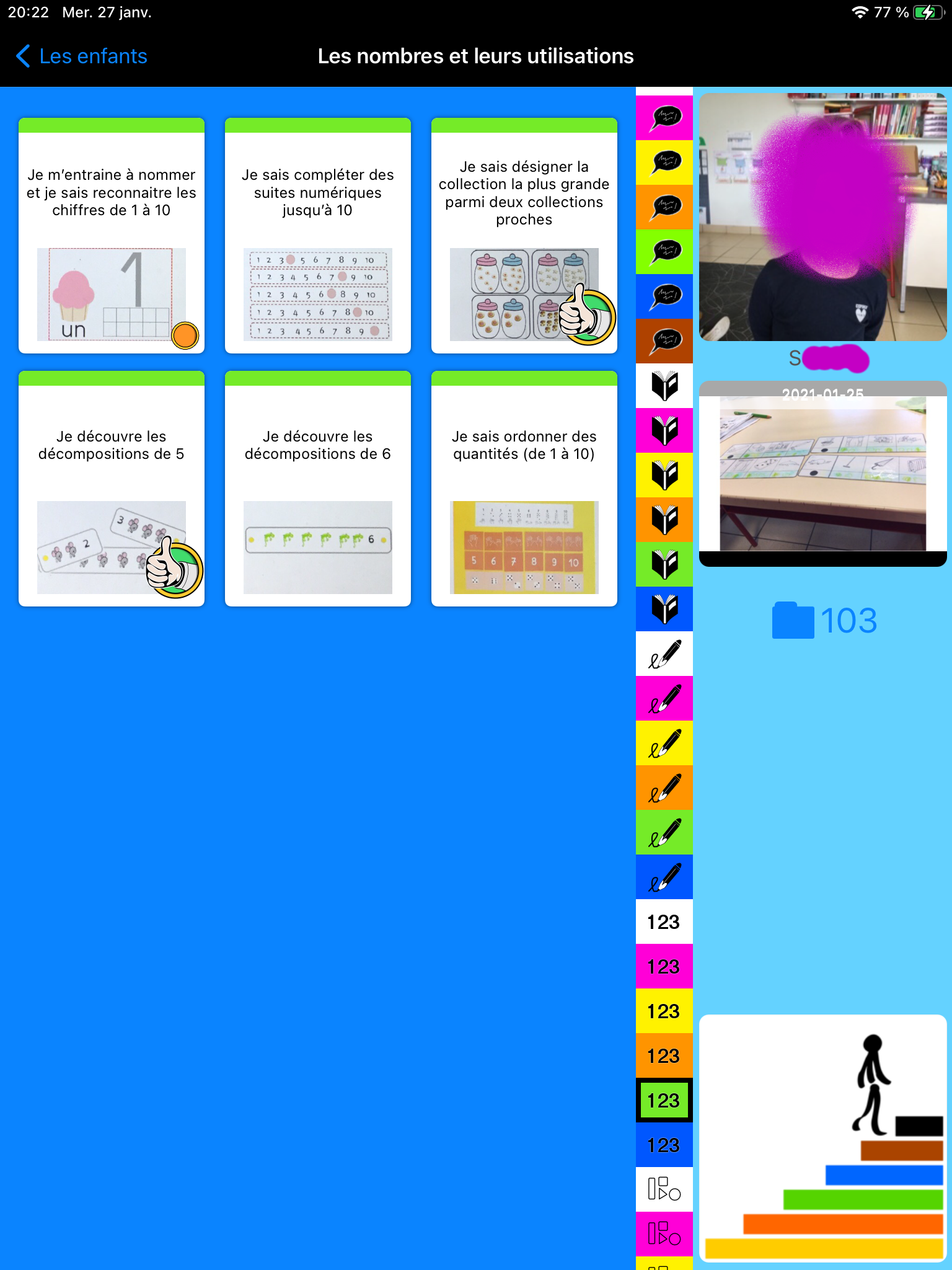 Les enfants sont libres de s'entrainer autant qu'iels le souhaitent sur les ateliers présents dans leur cahier. Quand iels pensent avoir réussi, ils peuvent demander la validation par un adulte (mon Atsem ou moi) si nous sommes disponibles ou prendre une photo avec l'iPad de la classe (pour une validation différée).