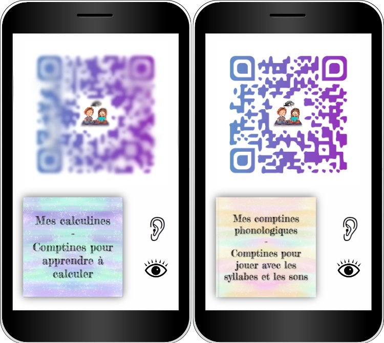 Les enfants peuvent y trouver des fiches avec un QR code. Ils peuvent scanner ces derniers grâce à mon ancien téléphone et ainsi accéder à BookCreator pour écouter les comptines en autonomie